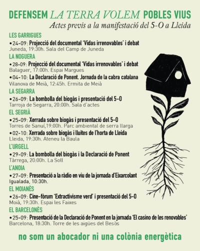 Des de Pobles Vius - La Sentiu us fem arribar una crida urgent. El 5 d’octubre a Lleida convoquem a sortir al carrer, amb més de 15 plataformes i entitats en defensa de la terra i de la vida rural. El govern vol aprovar abans de final d'any nombrosos macroprojectes especulatius que atempten contra la vida als pobles i Ponent en serà un territori especialment atacat. Aquesta mobilització vol marcar un punt d’inflexió i enviar un missatge clar al govern. Volem dir prou a l’assetjament territorial en forma de macroprojectes que patim i que perjudiquen la nostra qualitat de vida. També volem reivindicar una altra manera de viure i habitar els nostres pobles: amb justícia, dignitat i futur. Però per donar força real a la manifestació, necessitem que el manifest arribi ben lluny i amb el màxim de signatures possibles. És un relat per mostrar que som moltes persones i col·lectius units en defensa de la vida rural.